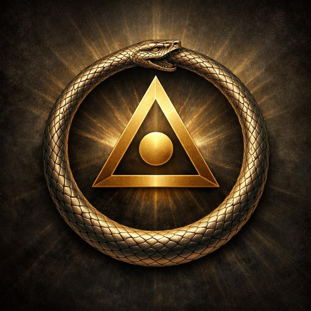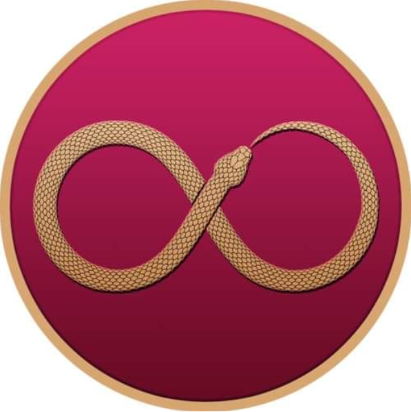 UNIDADE, HARMONIA; A imagem da cobra comendo sua própria cauda, ​​comumente chamada de ouroboros. Na mitologia de muitas culturas antigas, as cobras eram vistas como símbolos de auto-aperfeiçoamento constante. Esta é uma referência à habilidade de uma cobra de lançar sua pele e emergir como a mesma criatura em uma forma mais nova e melhor. O ouroboros representa o círculo da vida; a passagem da humanidade através de gerações que começam e terminam em um ciclo constantemente renovador. Ele mostra o caminho da mortalidade física - a verdade inescapável de que toda a vida começa sem nada e termina no mesmo lugar em que começou. Todos os humanos nascem da poeira e, ao pó, retornarão. ▲
